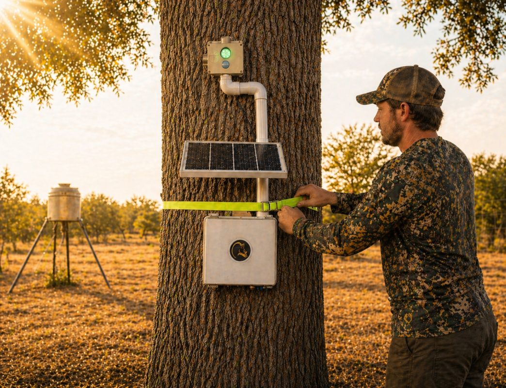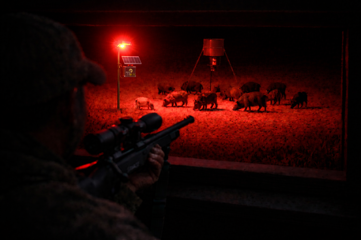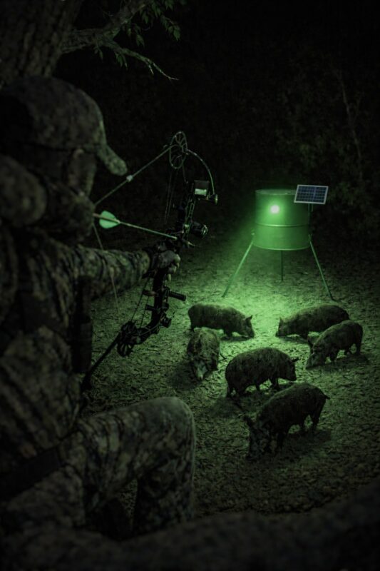 At it’s brightest, the light can illuminate a considerable area. Of course, it depends on a few factors: How high is the light mounted? And, at what angle is the light beam adjusted to, relative to the horizon? For example, If your light is approximately 10′ off the ground and the light is tilted down at 40 degrees from horizontal, it will illuminate an area approximately 25′ wide x 50′ distance and beyond. Any hog within this area will be illuminated well enough for an ethical shot through a std rifle scope. Again, results will vary, based on mounting location and position. I can say that our light gets very bright! Alot of hunters are under the impression that the brighter the light, the better. That applies when you are using a hunting flashlight mounted to your rifle, but when providing light around a baited area, brighter is NOT necessarily better. It can actually prevent the larger, older and wiser hogs from ever approaching. And, don’t be fooled by those ads that show images of a flat panel feeder light bolted to a post that lights up the entire area around a feeder like a football stadium. This is simply false advertising.