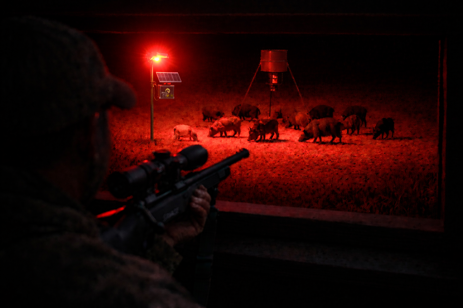 2. Our light is intended to be mounted in an elevated position, between 6′ and 10′ above the ground. That way the light is not shining ‘at’ them. Instead, it is shining downward, on them. This, in combination with our light being very dim when no motion is detected, hogs are not intimidated by the presence of a ‘scary’ light shining in their eyes. They don’t have to grow accustomed to it. Put it up that day and hunt that night.