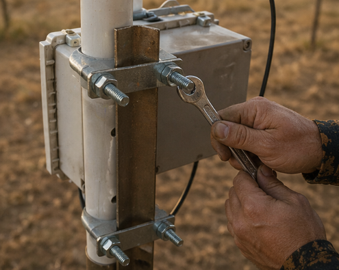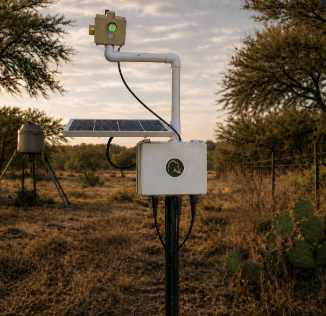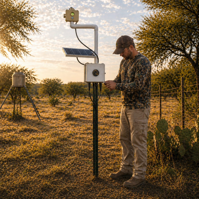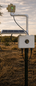 You can mount our light just about anywhere, quickly and easily. With our optional mounting kit (with solar), you can mount to any type of feeder, a tree trunk, T-post, fence post, etc. For example, if mounting to a T-post, a 3′ piece of 1″ PVC pipe, obtained from any hardware or building supply store, can easily be added to extend the light up to 9′ above the ground from a std 6′ post. The flexibility and options are endless.