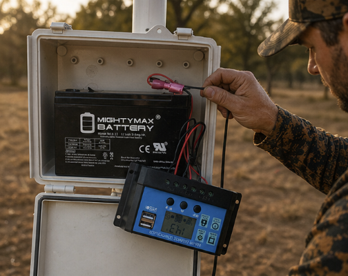 The battery is recharged by solar power. The system requires a 12v feeder type battery. The battery (not included) is recharged during the day by a solar panel and solar controller that is connected to the battery, contained in a battery box. All of this is part of our mounting kit except the battery. The solar panel charging system allows the light to be mounted and left alone for long periods of time. Simply show up and hunt. (FYI, it is prohibitive for us to store and ship batteries and can be easily purchased online or at most hardware, sporting goods and feed stores)